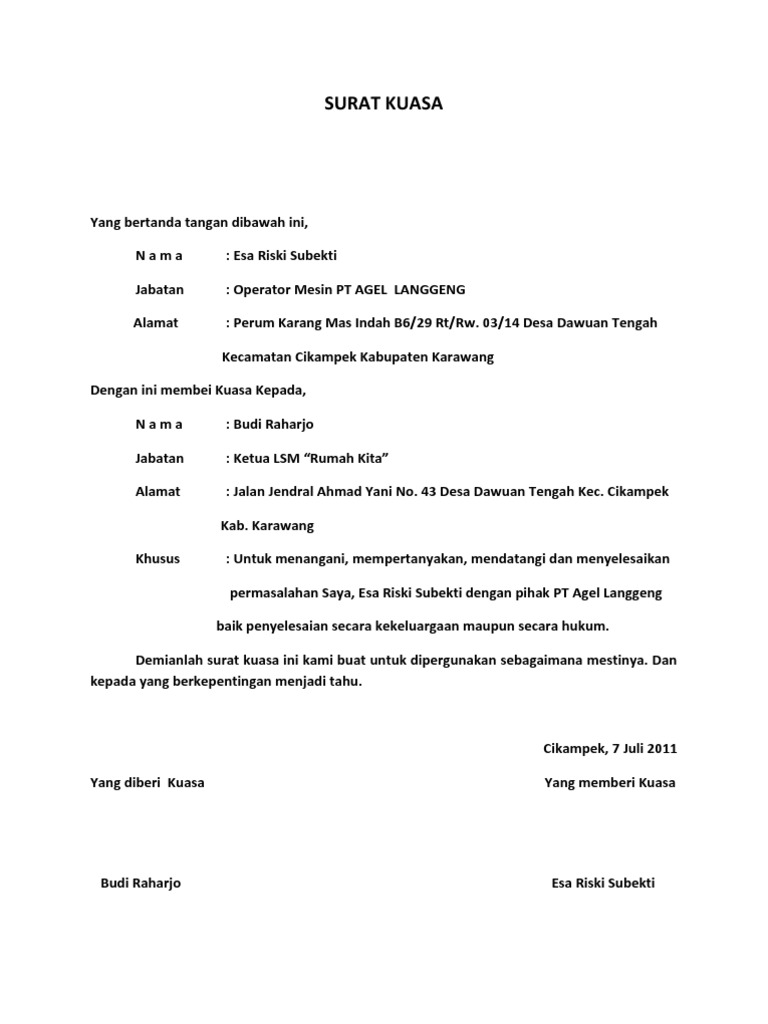 Bantuan hukum ini merupakan hak dalam menghadapi konflik dan permasalahan hukum kepada seseorang atau pejabat sepanjang. Surat kuasa adalah surat yang berisi pelimpahan wewenang dari seseorang atau pejabat tertentu kepada seseorang atau pejabat lain. Untuk merombak, membantu dan juga memberi nasihat hukum kepada pemberi kuasa yang menjadi pihak dituduh atau dicurigai sudah melakukan atau menetapkan pasal 27 mengenai informasi dan transaksi elektronik (uu ite). Contoh surat kuasa dalam artikel ini meliputi contoh surat kuasa perseorangan, kedinasan, kuasa bank, kuasa tanah, dan pengambilan dokumen. Biasanya surat berharga ini tidak dapat diambil begitu saja, jika bukan oleh orang yang.